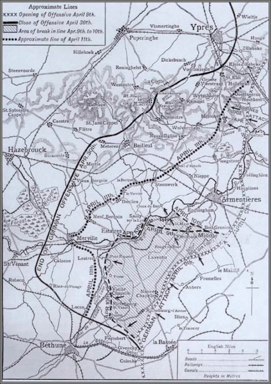 Le 11, accentuant leur pression, les Allemands s’emparent d’Armentières, Merville, Estaires, Neuf-Berquin, Le Doulieu, Steenwerck et Nieppe. Ils sont aussi sur le point d’atteindre la lisière de la forêt de Nieppe qui couvre Hazebrouck et Cassel.